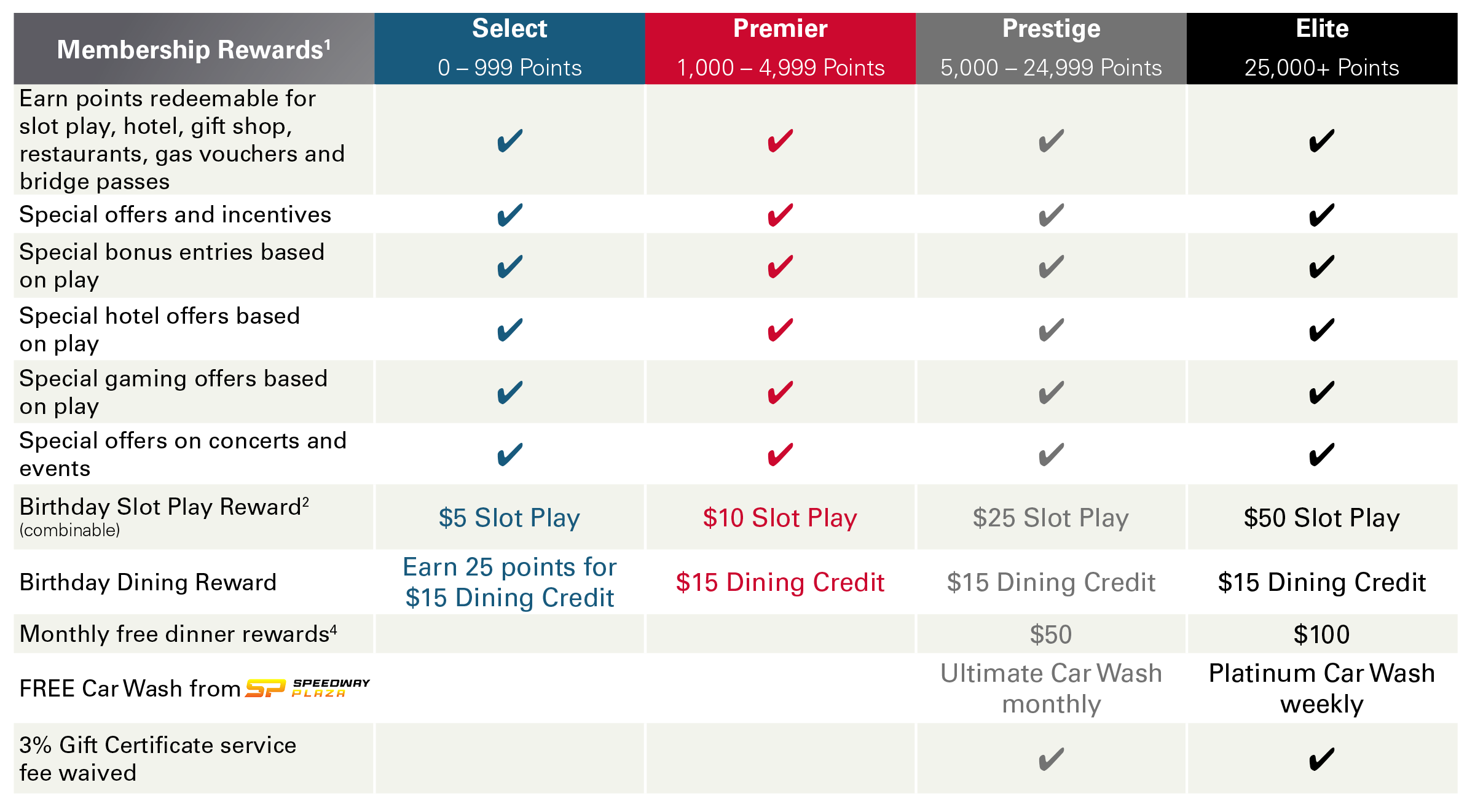 Winners Club members earn special benefits based on tiers including special offers, food discounts, Birthday Rewards, hotel deals, member promotions, and more based on your play. The higher your status, the more perks and benefits you’ll receive.