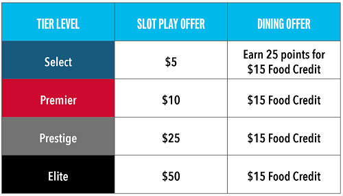 Slot play is combinable. Birthday offers are valid one time only, non-transferable, and only available during birthday month. Guest must earn 25 points within one day to receive $15 food credit (12 am to 11:59 pm). Offers can be redeemed at any promotional kiosk any day of the week during birthday month. Management reserves all rights.