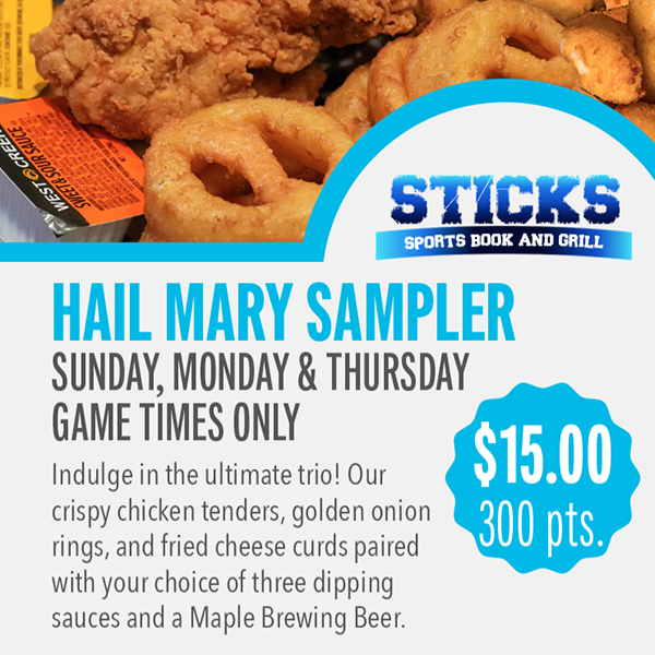 Grab a cold one and catch every play on the big screens while you enjoy the unbeatable atmosphere of Sticks Sports Book & Grill. And no game is complete without a freshly brewed pint from Maple Brewing—crafted right here for fans like you.